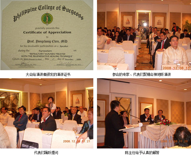 第64屆菲律賓外科醫(yī)師學會(Philippines College of Surgeons)學術年會于2008年12月8日至11日,在菲律賓首都馬尼拉市香格里拉酒店隆重召開。菲律賓外科醫(yī)師學會的學術年會是每年召開一次的全國性醫(yī)學大會,會議涵蓋的學科有“普通外科專業(yè)”、“整形整容與重建外科專業(yè)”、“骨科創(chuàng)傷專業(yè)”等十二個專業(yè)和領域。參加大會的有來自全國20多個省、市的專家和學者1500多人,是每年全國外科醫(yī)師相聚一堂進行學術交流的盛會。其中,參加本次“整形整容與重建外科專業(yè)”專題會議的專家代表有約90人。中國中西醫(yī)結合學會燒傷專業(yè)委員會委員、中國燒傷創(chuàng)瘍科技中心臨床部主任陳永翀應邀出席本次大會并做專題演講。