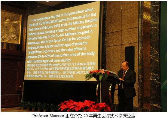 來自敘利亞整形修復外科中心主任醫(yī)學博士、整形修復外科醫(yī)生Adham MANSOUR醫(yī)生與1992年開始接觸再生醫(yī)療技術(shù),至今已經(jīng)有20余年再生醫(yī)療技術(shù)臨床經(jīng)驗。自從1992徐教授到敘利亞訪問后,Dr. Mansour 就對再生醫(yī)療技術(shù)產(chǎn)生了濃厚的興趣并開始嘗試使用該技術(shù)治療燒傷病人。在成功救治了無數(shù)不同面積類型燒傷患者后,他又大膽嘗試將該技術(shù)應(yīng)用于其他創(chuàng)面。經(jīng)過20多年的臨床應(yīng)用,他已經(jīng)成功的將再生醫(yī)療技術(shù)應(yīng)用于各類型燒傷創(chuàng)面,激光美容創(chuàng)面,整形創(chuàng)面等并通過大量鮮明的治療前后對比照片展示了再生醫(yī)療技術(shù)的優(yōu)越性,現(xiàn)場代表無不折服。