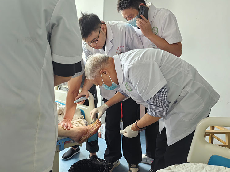 9月22日,應(yīng)分宜縣中醫(yī)院外科主任林主任邀請,《中國燒傷創(chuàng)瘍雜志》編委、燒傷創(chuàng)瘍再生醫(yī)療技術(shù)臨床專家金黨軍前往該院為一例糖尿病足下肢潰瘍患者進行會診,并親自為患者進行清創(chuàng)換藥,示范再生醫(yī)療技術(shù)在治療糖尿病足的臨床規(guī)范應(yīng)用,獲得了科室醫(yī)生的高度認可。