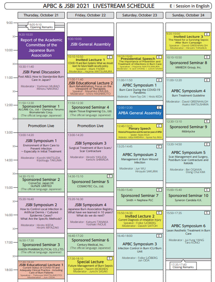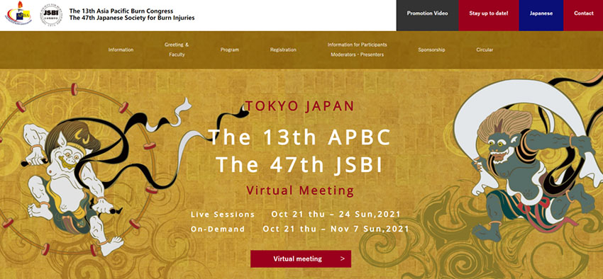 2021年10月21日至10月24日,第13屆亞太燒傷會議(APBC 2021)暨日本燒傷學會(JSBI)第47屆年會以虛擬會議的形式舉行。亞太燒傷會議是國際燒傷會議日歷上的一項重要活動,它匯聚了來自各國的醫(yī)生、護士及科研人員等,為全球醫(yī)務工作者分享臨床治療經驗、最新研究成果和臨床管理方法提供了一個寶貴的平臺。本屆大會的主題為“燒傷治療的下一次動態(tài)變化——應對感染、預防和控制感染”(The Next Dynamic Change in Burn Care – Coping with Infection, Infection Prevention and Control)。