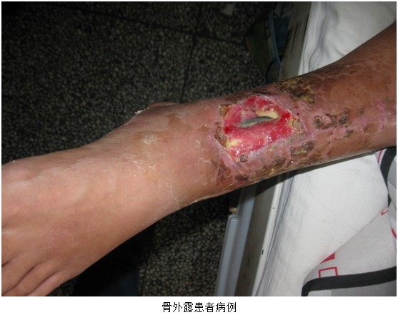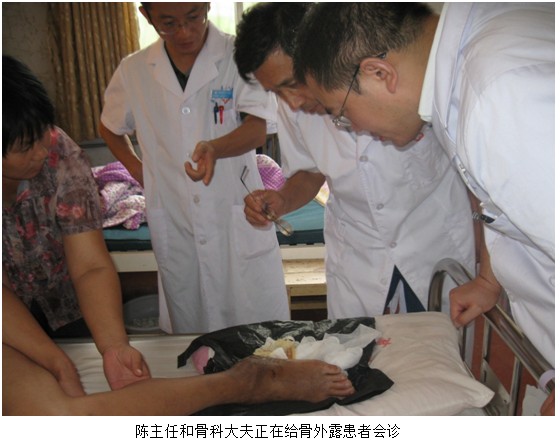 該院骨科有兩位骨外露患者已術(shù)后多日,傷口不愈合,請陳主任會診:第一例病人張某,男,半年前因車禍造成左小腿粉碎性骨折,手術(shù)后半年傷口不愈合,骨和鋼板暴露;第二例病人王某,男,右足跟部被汽車軋傷,踝骨骨折,手術(shù)后傷口不愈合96天。會診后陳全喜主任結(jié)合兩個病人進行了病情分析,接著系統(tǒng)講述了皮膚原位再生醫(yī)療技術(shù),并把治療的骨外露的病例進行了展示。科室六位大夫聽了皮膚原位再生醫(yī)療技術(shù)和看到的治療病例,很是欽佩。主任李季然說:“陳主任,在您的指導(dǎo)下,讓這兩位病人應(yīng)用皮膚原位再生醫(yī)療技術(shù)治療,讓我們學(xué)習(xí)吧” 。