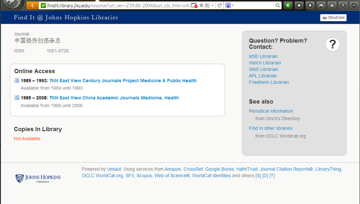 約翰•霍普金斯大學(xué)(Johns Hopkins University)收錄中國燒傷創(chuàng)瘍雜志
