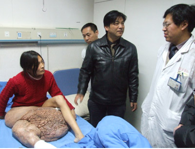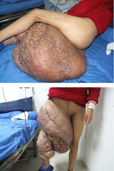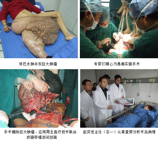 2009年3月1日,一名患淋巴水腫并發(fā)巨大腫瘤的患者在南通市第三人民醫(yī)院暨中國燒傷創(chuàng)瘍科技中心南通整形燒傷中心成功接受中西醫(yī)結(jié)合皮膚再生療法實施腫瘤切除手術(shù)。腫瘤重達(dá)50多公斤(患者稱重為99.5 公斤),據(jù)檢索,目前國內(nèi)外尚無成功切除淋巴水腫并發(fā)如此巨大腫瘤的報道。