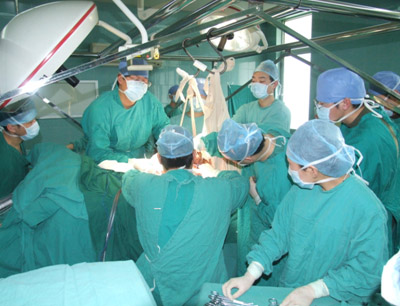 3月1日上午8點,我院手術(shù)室里一片繁忙景象,經(jīng)過醫(yī)護人員1個半小時的努力,克服了巨大腫瘤造成的困難,術(shù)前患者體位合適,麻醉成功。9點50分,手術(shù)正式開始,由我院整形燒傷科趙賢忠主任與上海長征醫(yī)院整形外科江華主任共同主刀,麻醉由經(jīng)驗豐富的顧仁勇主任和邢春花主任主持,陳松院長親臨現(xiàn)場協(xié)調(diào)。為了便于手術(shù),腫瘤被特制的布兜懸吊于半空,布兜的兩端被固定在專門為這次手術(shù)特制的手術(shù)架上。專家們在助手的配合下,按照預(yù)定方案切開皮膚,沿著腫瘤邊緣小心分離,對腫瘤根部粗如手指的血管仔細(xì)分離、鉗夾、切斷、雙重結(jié)扎,憑借著嫻熟的技術(shù),僅僅3個小時后,折磨患者達(dá)15年之久的腫瘤就被完整地切除下來,流失液分的腫瘤就像一只匍匐著的海豹。接下來的任務(wù),是如何更好的修復(fù)創(chuàng)面,同時避免新的創(chuàng)面形成。