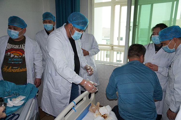 湖南省湘雅三醫(yī)院左笑叢副院長(zhǎng)、中國(guó)中西醫(yī)結(jié)合學(xué)會(huì)燒傷專業(yè)委員會(huì)主委周建大教授和燒傷修復(fù)重建外科主任彭浩教授熱情接待了蒙古國(guó)醫(yī)生團(tuán)一行。左院長(zhǎng)對(duì)蒙古醫(yī)生團(tuán)表達(dá)了誠(chéng)摯的歡迎并期待中蒙兩國(guó)醫(yī)生間的交流能更好加強(qiáng)彼此在醫(yī)療領(lǐng)域方面的合作。彭教授則結(jié)合病例進(jìn)行了悉心講解與經(jīng)驗(yàn)分享,為來(lái)訪醫(yī)生系統(tǒng)介紹了燒傷創(chuàng)瘍?cè)偕t(yī)療技術(shù)。蒙古國(guó)醫(yī)生對(duì)該項(xiàng)技術(shù)的臨床應(yīng)用及該院在創(chuàng)面修復(fù)治療與管理方面的經(jīng)驗(yàn)贊嘆不已,雙方還就燒傷術(shù)后創(chuàng)面護(hù)理及修復(fù)方面的問(wèn)題進(jìn)行了討論。