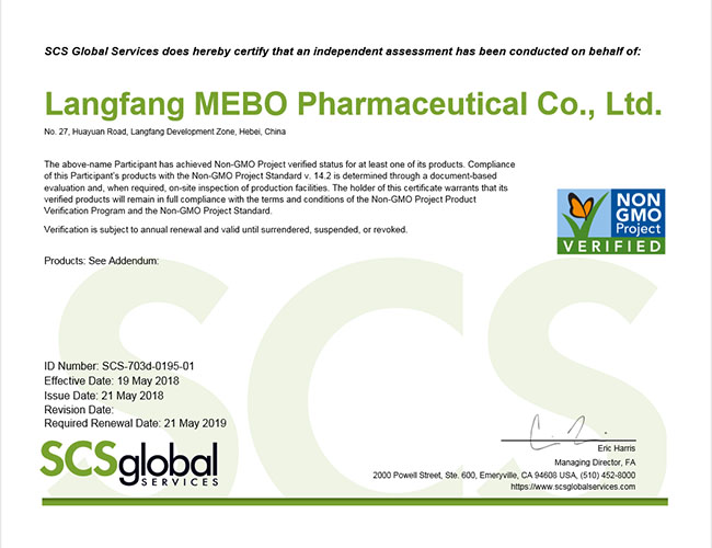 2018年5月21日,經(jīng)國(guó)際知名第三方認(rèn)證公司SCS Global Services承辦,美寶廊坊基地通過(guò)非轉(zhuǎn)基因項(xiàng)目認(rèn)證。