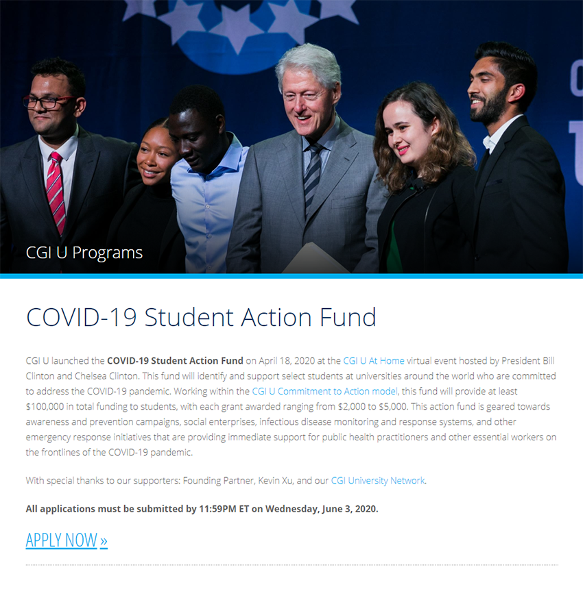 2020年美東時間4月18日,美寶集團董事局主席徐鵬聯(lián)合克林頓在克林頓全球倡議大學(CGIU)宣布發(fā)起“ 新冠病毒學生行動基金”(COVID-19 Student Action Fund)。目前,這項用于激勵與支持致力于解決新型冠狀病毒(COVID-19)危機的世界各地的大學生的基金的申請行動已經(jīng)開始。