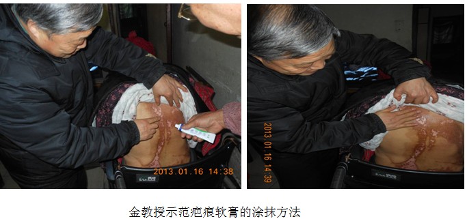 此次來到宜昌,金教授還走訪了一位背部大面積燙傷的老年患者,使用美寶疤痕軟膏快兩個月,患者中風(fēng)不能行走,之前市場技術(shù)支持人員曾發(fā)過圖片并進(jìn)行過電話指導(dǎo),此次金教授向家屬詳細(xì)了解了情況,并親自示范如何涂抹藥膏,如何使藥膏發(fā)揮更大作用。