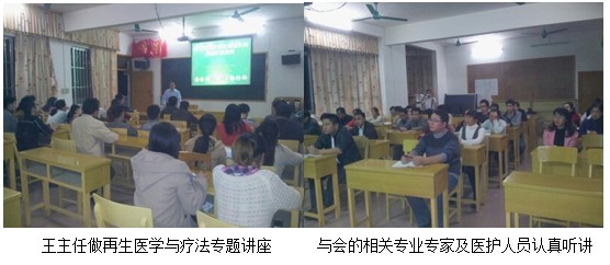 晚上7:30,在該院外科主任龔應科主持下,學術(shù)講座在醫(yī)院的會議室正式開始。該院院長何東鎮(zhèn)帶領(lǐng)醫(yī)院的醫(yī)護人員30多人到會聆聽王主任的專題講座。在專題學術(shù)講座中,王主任結(jié)合了大量的臨床病例圖片,針對不同深度的燒傷創(chuàng)面及各類難愈性創(chuàng)傷、潰瘍創(chuàng)面的規(guī)范化處理方法與技巧、注意事項等進行了細致地講解。在會的醫(yī)護人員看到大量真實的臨床病例資料圖片后,都被再生醫(yī)療技術(shù)良好的治療效果所震撼與折服。此次講座深受會者的歡迎,再生復原技術(shù)為醫(yī)護人員在臨床上提供了一條新的治療思路,開闊了醫(yī)護工作者的視野,增長了新的知識。